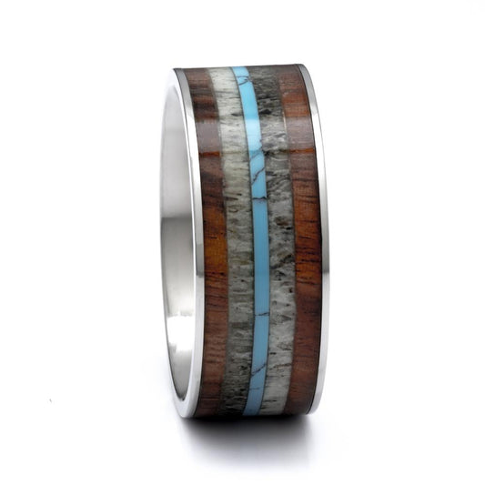 Titanium Ring With Antler, Koa Wood and Turquoise Inlay, 9mm Comfort Fit Wedding Band